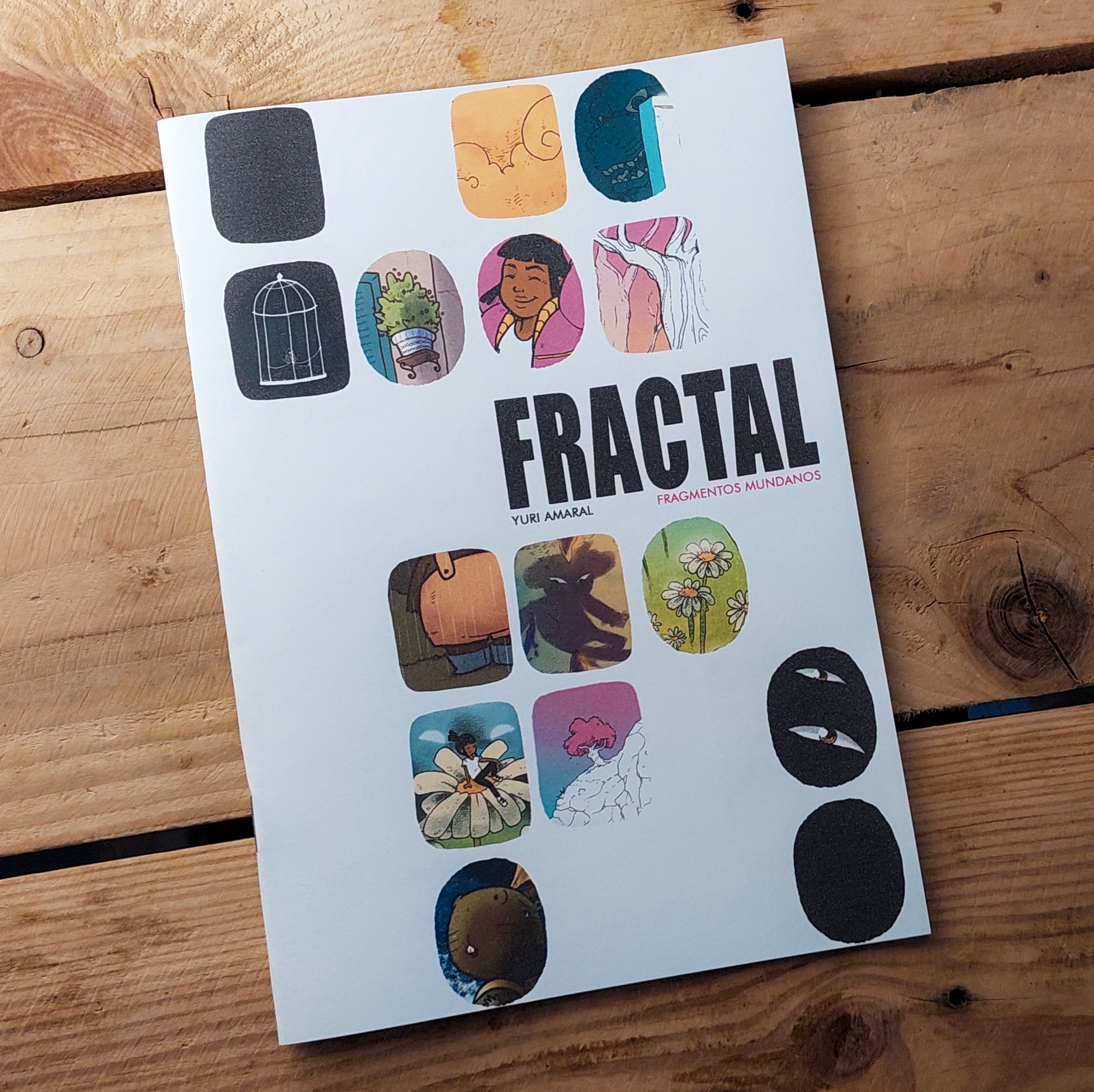 Criada por Yuri Amaral entre 2020 e 2022, Fractal – Fragmentos Mundanos traz nossa heroína para seu momento presente, perdida com tudo que aprendeu sobre si mesma e sobre seu passado anteriormente (Zero e Interlúdios), enfrenta o cotidiano com ternura, aceitando ajuda e sentindo cada momento como lhe é possível. Sensível e agridoce, as tirinhas e poemas desse zine artesanal foram pensadas como fábulas sem moral, um convite a definir nossos valores com autonomia e comunidade. Não pode faltar na sua coleção hehe