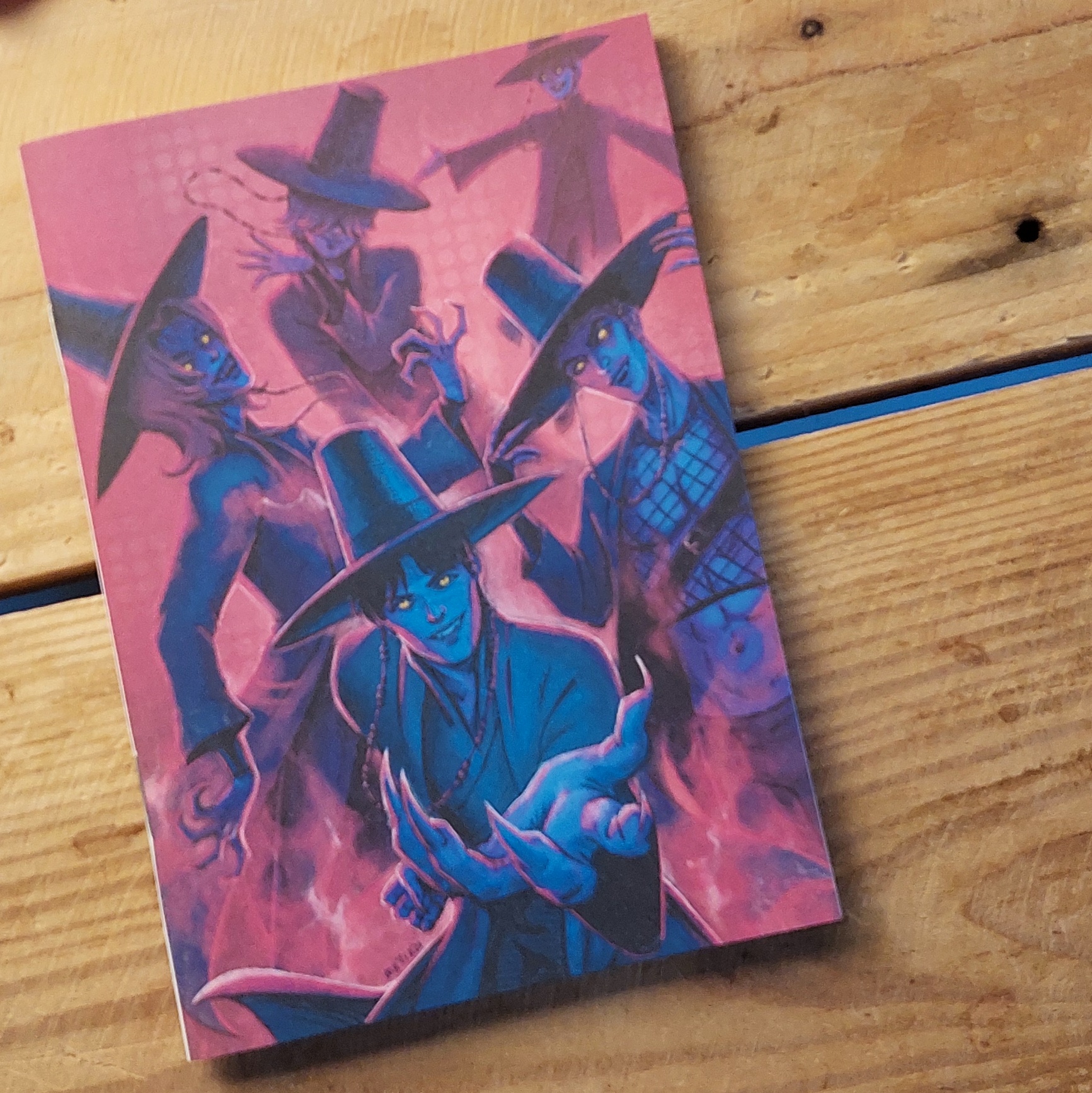 Esse quadernito tem fanart das Huntrix, criada por Matiazi, artista curitibana queer, quadrinista e ilustradora, escritora, autora da série de quadrinhos O Abismo, O Feiticeiro e da recém comic indicada ao HQ Mix “O grito silencioso”.